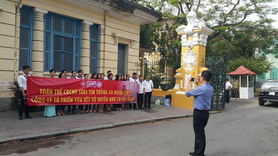 Nhân viên một công ty bị hại của vụ án căng băng rôn trước tòa. Ảnh: HY