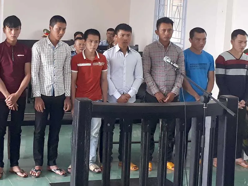 Nhóm bị cáo công nhân Công ty Long Sơn tại phiên xử ngày 19-9. Ảnh: ĐẠI DŨNG