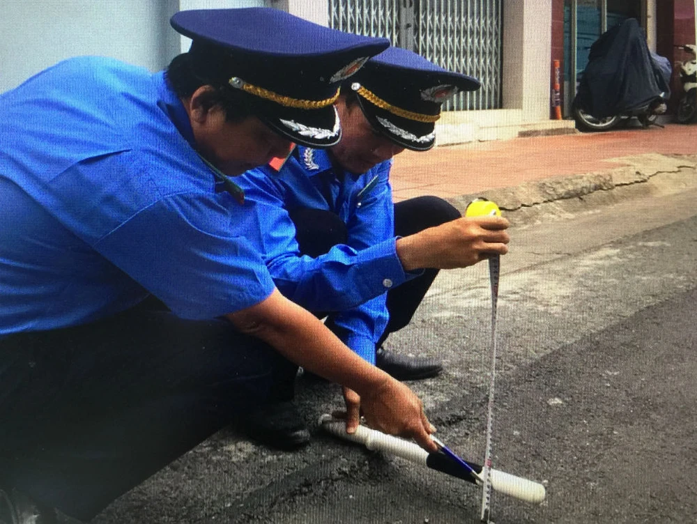 Thanh tra Giao thông đội số 3 đo độ vênh giữa đường cũ và đường mới tái lập để xác định rõ lỗi hoàn trả mặt đường không đúng nguyên trạng.