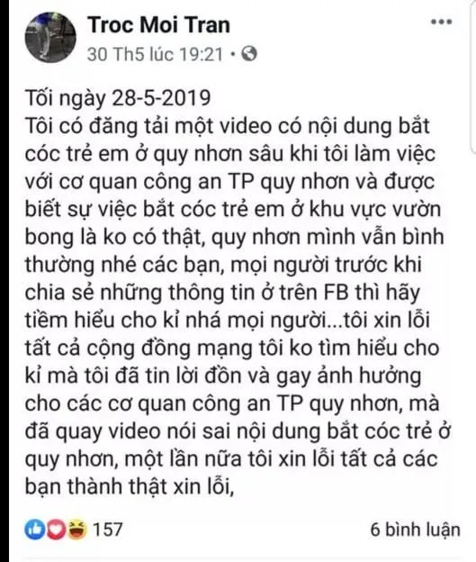 Cùng thời điểm, ông V. sử dụng tài khoản Facebook “Troc Moi Tran” đăng tải video clip, kèm nội dung: “Thông báo khẩn cấp hiện nay ở Quy Nhơn đã có xuất hiện tụi bắt cóc trẻ em…”. Video clip này cũng có hơn 1.400 lượt chia sẻ, rất nhiều bình luận.