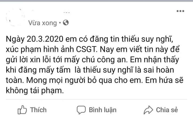 Sau khi bị mời đến làm việc, T. nhận lỗi, cam kết gỡ bỏ bài viết.