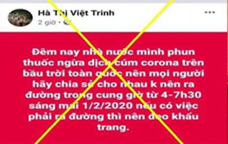 Hôm qua, Hà Thị Việt Trinh đã đăng tải lên Facebook cá nhân với nội dung: “Đêm nay nhà nước mình phun thuốc ngừa dịch cúm Corona trên bầu trời toàn quốc nên mọi người hãy chia sẻ cho nhau. Không nên ra đường trong cung giờ từ 4-7 giờ 30 sáng mai 1/2/2020 nếu có việc phải ra đường thì nên đeo khẩu trang”.