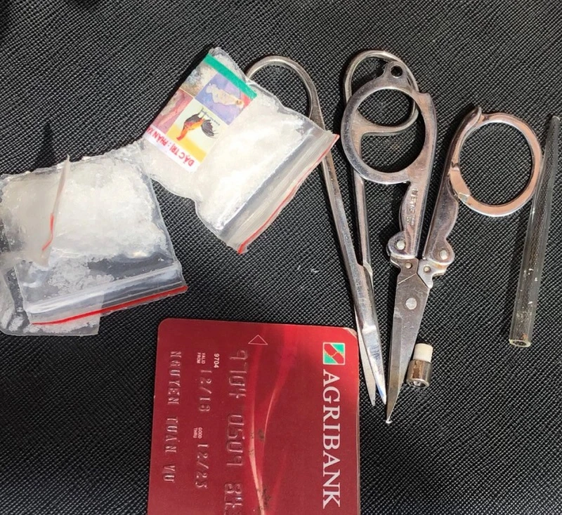 Tại hiện trường, lực lượng công an thu giữ ba gói nghi ma tuý đá, một dụng cụ sử dụng ma tuý và số tiền 2 triệu đồng.