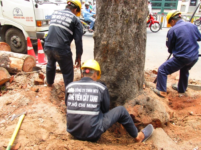 Các nhân viên của Công ty TNHH MTV Cây xanh Đô thị TP.HCM đang đào gốc một số cây xanh trên đường Đinh Tiên Hoàng. Ảnh: PHƯỚC TĨNH