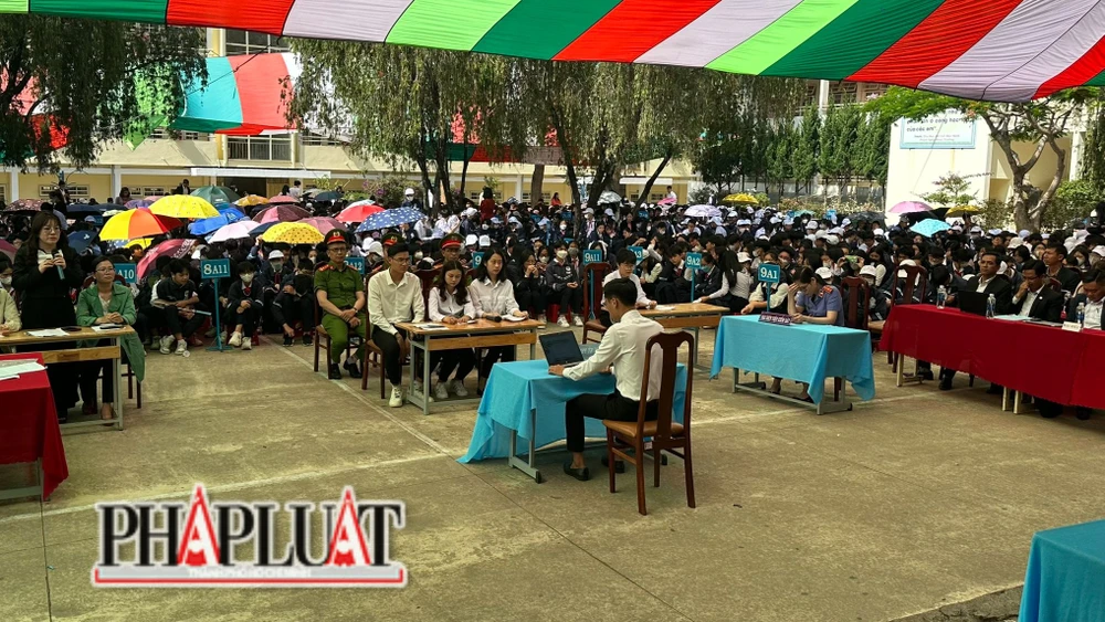 (PLO)- Phiên toà giả định lấy tình huống do có mâu thuẫn từ việc yêu đương, một nhóm học sinh lớp 10 đã hẹn đánh nhau, dùng điện thoại ghi hình và ép bạn học quỳ gối xin lỗi.
