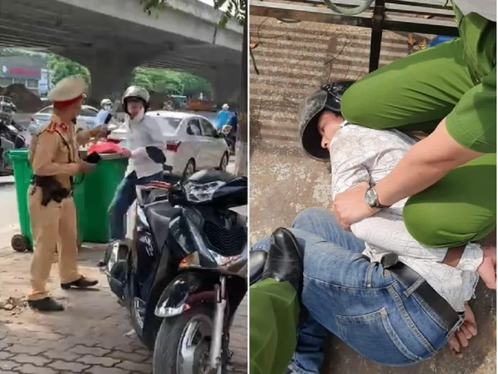 Cảnh sát khống chế Nguyễn Văn Nghị vì có hành vi chống đối CSGT. Ảnh: FB