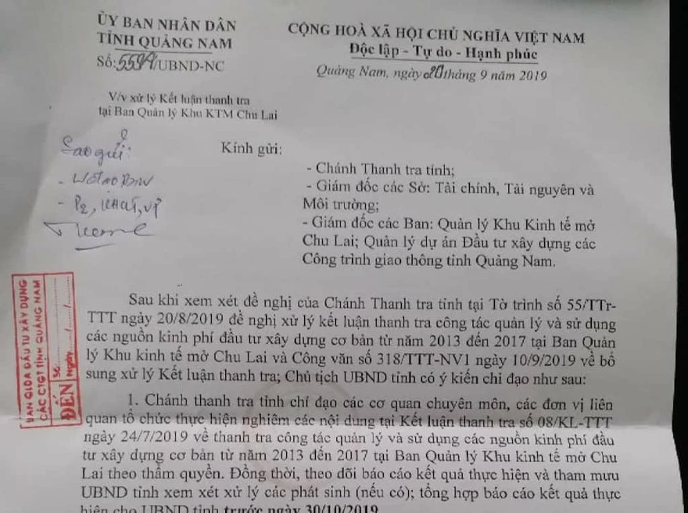 Ngày 1-10, ông Đinh Văn Thu - Chủ tịch UBND tỉnh Quảng Nam, xác nhận đã ký công văn số 5594/UBND-NC về việc xử lý kết luận thanh tra tại Ban quản lý Khu kinh tế mở Chu Lai.