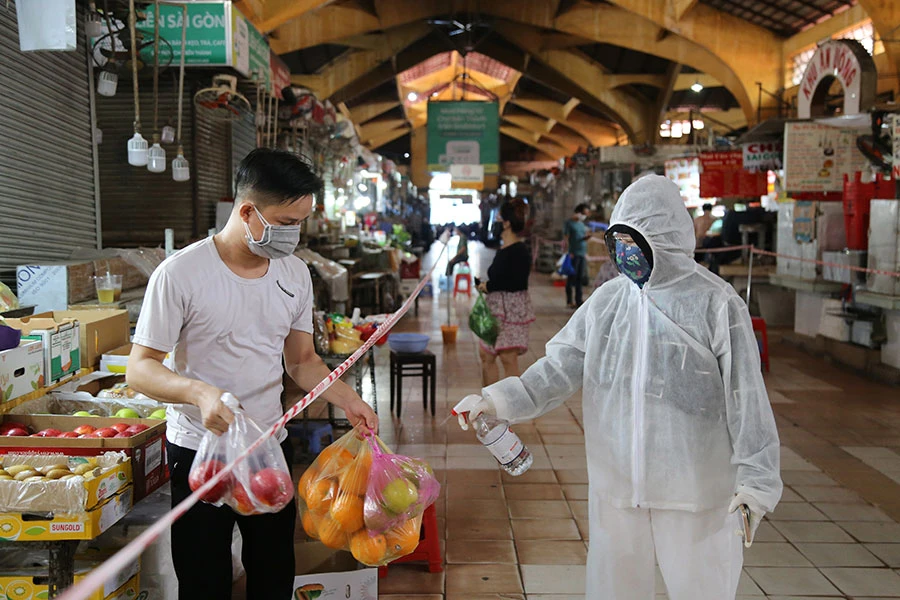 Người dân mặc đồ bảo hộ, sát khuẩn và giữ khoảng cách khi mua hàng
