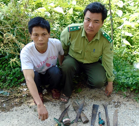 Vi Văn Sơn (áo thun trắng) khi bị bắt cùng các dụng cụ “xẻ” thịt voọc chà vá chân nâu. Ảnh: TT