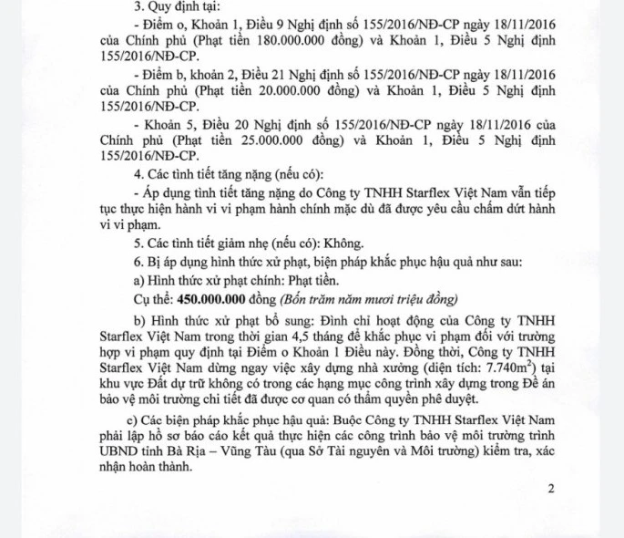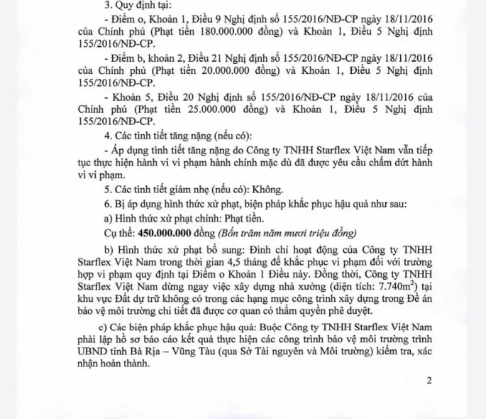 Bên cạnh xử phạt tiền, UBND tỉnh còn quyết định đình chỉ hoạt động của công ty TNHH Starflex Việt Nam trong thời gian 4,5 tháng để khắc phục vi phạm.
