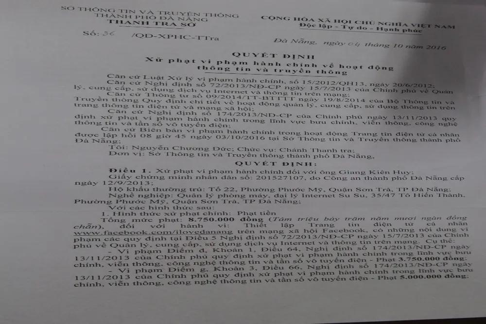 Chiều 5-10, tin từ Sở TT&TT TP Đà Nẵng cho hay cơ quan này vừa ra quyết định xử phạt vi phạm hành chính đối với Giang Kiên Huy (ngụ quận Sơn Trà, Đà Nẵng) về hành vi vi phạm các quy định về quản lý, cung cấp, sử dụng dịch vụ Internet và thông tin trên mạng.