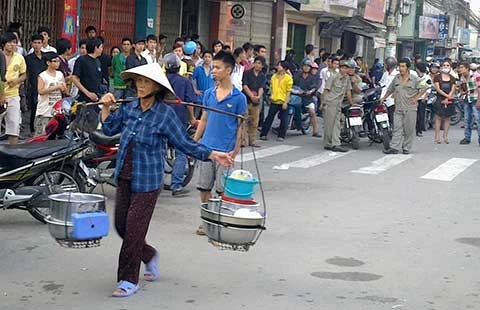 Người dân hiếu kỳ tụ tập theo dõi lực lượng chức năng khống chế kẻ “ngáo đá” gây rối. Ảnh: CTV