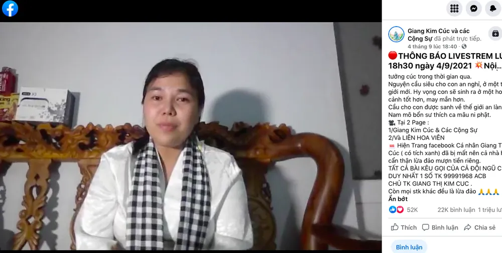Giang Kim Cúc, trưởng nhóm Giang Kim Cúc và các Cộng Sự trong livestream xin lỗi vào ngày 4-9. Ảnh: Chụp màn hình Fanpage