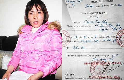 Chị Cao Thị Thu Hằng và giấy triệu tập bị can của Công an tỉnh Phú Thọ yêu cầu chị sáng nay (8-12) lên làm việc. Ảnh: CHÂN LUẬN