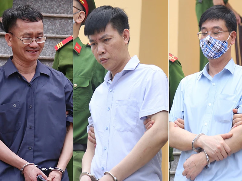 Các bị cáo Nguyễn Quang Vinh, Đỗ Mạnh Tuấn và Khương Ngọc Chất (từ trái qua) có nhiều lời khai mâu thuẫn nhau. Ảnh: TP