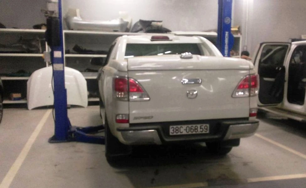 Chiếc xe Mazda BT 50 của ông Thông đang nằm ở xưởng, chờ tòa án phân xử bảo hành.