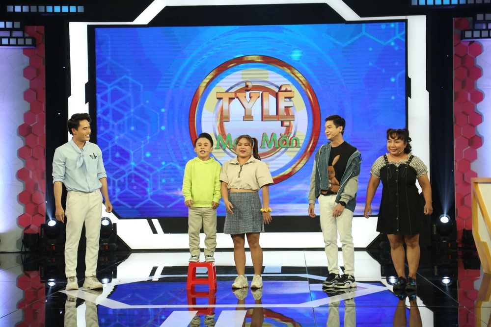 Chàng lùn Xuân Tiến làm động tác dập bóng chạy đến bên MC Võ Tấn Phát đang giơ tay làm sào và đứng lên ghế nhựa nhảy lên làm động tác đập bóng biến không khí trường quay bùng nổ tiếng cười.
