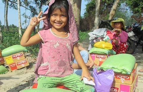 Niềm vui của một em nhỏ theo gia đình đi nhận quà. Ảnh: H.MINH