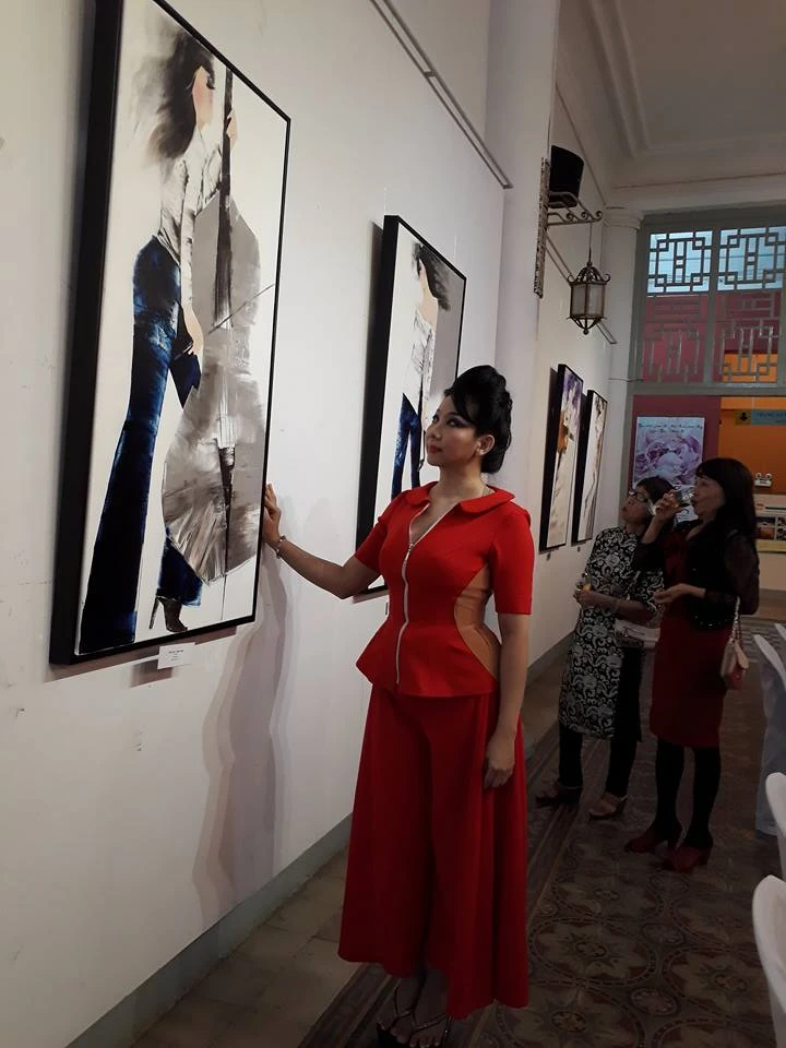 Nhà thiết kế Quỳnh Paris đang xem tranh.