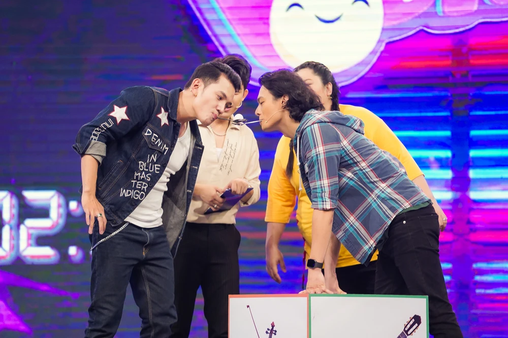 Trong khi hai anh chàng Lý Bình – Henry Nguyễn cao to lực lưỡng thì đội còn lại xuất hiện trong hình ảnh mẹ bồng con theo đúng nghĩa đen: Tuyền Mập ẵm Xuân Tiến ra chào sân trong sự ngỡ ngàng của MC Quốc Bảo.