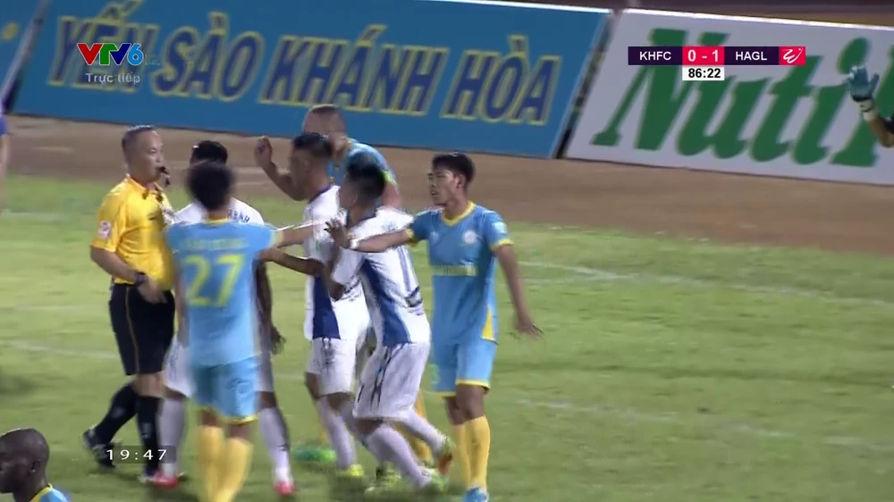 Trở lại cuộc đối đầu căng thẳng trên sân Nha Trang, cầu thủ hai đội có những pha va chạm mạnh khiến cho khu vực kỹ thuật hai phía không yên. Trợ lý Trần Thiện Hảo của Sanna Khánh Hòa và bác sĩ Đồng Xuân Lâm của HA Gia Lai tranh cãi suýt dẫn đến xô xát bị trọng tài đuổi thẳng lên khán đài.