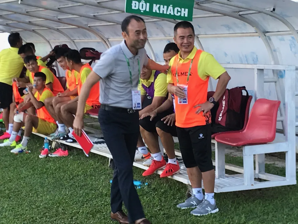 HLV Lee Tae-hoon thân thiện với đồng nghiệp trẻ Phạm Minh Đức. Ảnh: HÀ NGỌC.