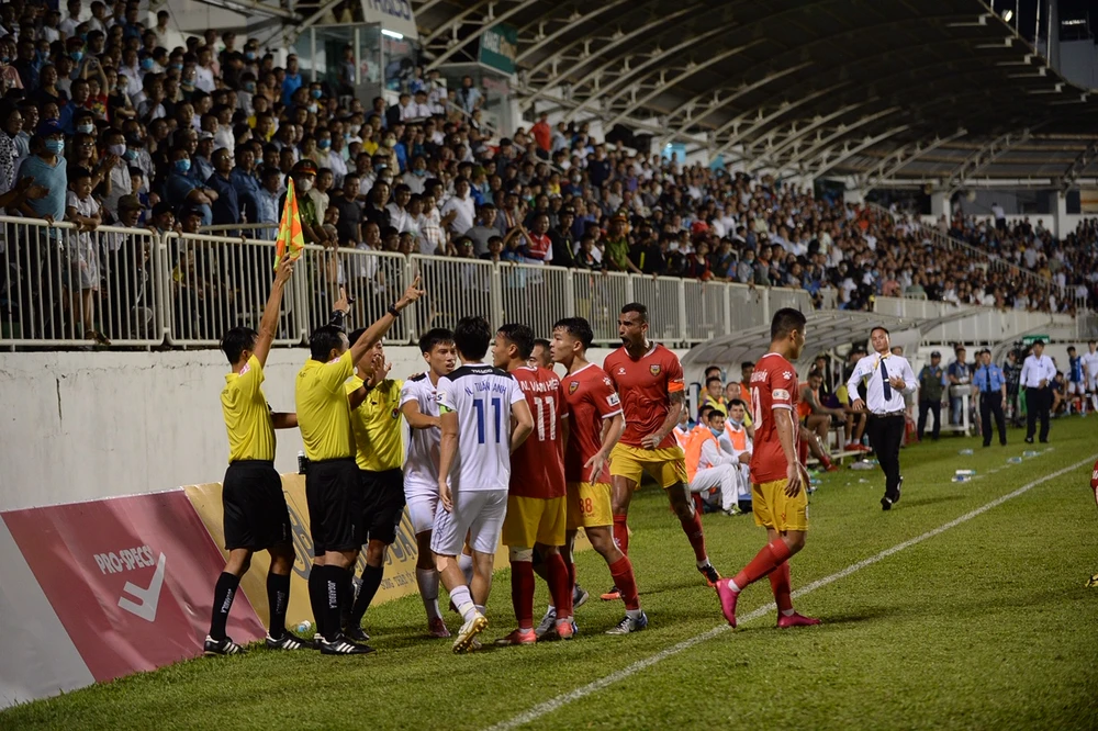 Trận đấu có lúc nóng lên khi cầu thủ Hà Tĩnh phản ứng trợ lý trọng tài, dù bắt đúng pha bóng việt vị. Ảnh: HÀ NGỌC.