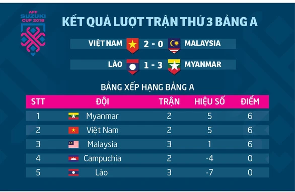 Trận thắng đối thủ lớn Malaysia đã dần mở ra cánh cửa bán kết cho đội tuyển Việt Nam với ngôi đầu bảng A, dù thầy trò Park Hang-seo còn xếp dưới Myanmar do cùng 6 điểm nhưng kém hiệu số bàn thắng bại.