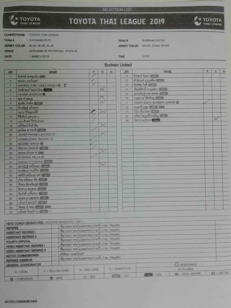 Bản danh sách xuất phát của Buriram, Xuân Trường (số 21) ra sân đội hình xuất phát