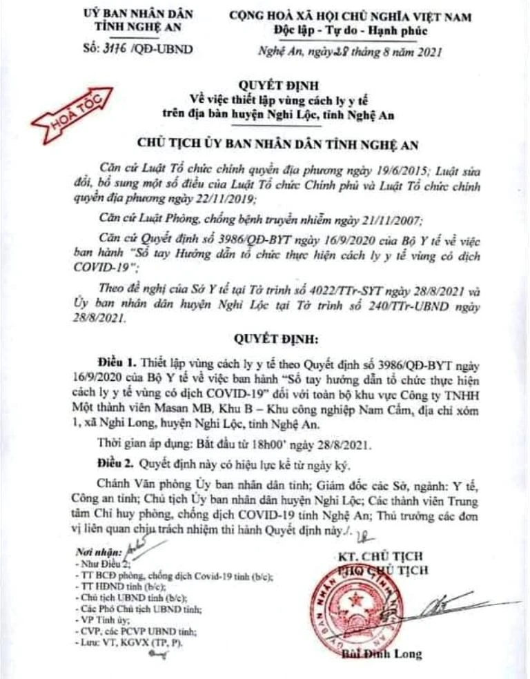 Trước đó, ngày 28-8, sau khi xuất hiện một công nhân F0, chủ tịch UBND huyện Nghi Lộc đã ký tờ trình gửi UBND tỉnh và Ban chỉ đạo phòng, chống dịch COVID-19 tỉnh Nghệ An về việc thiết lập vùng cách ly y tế trên địa bàn huyện Nghi Lộc.