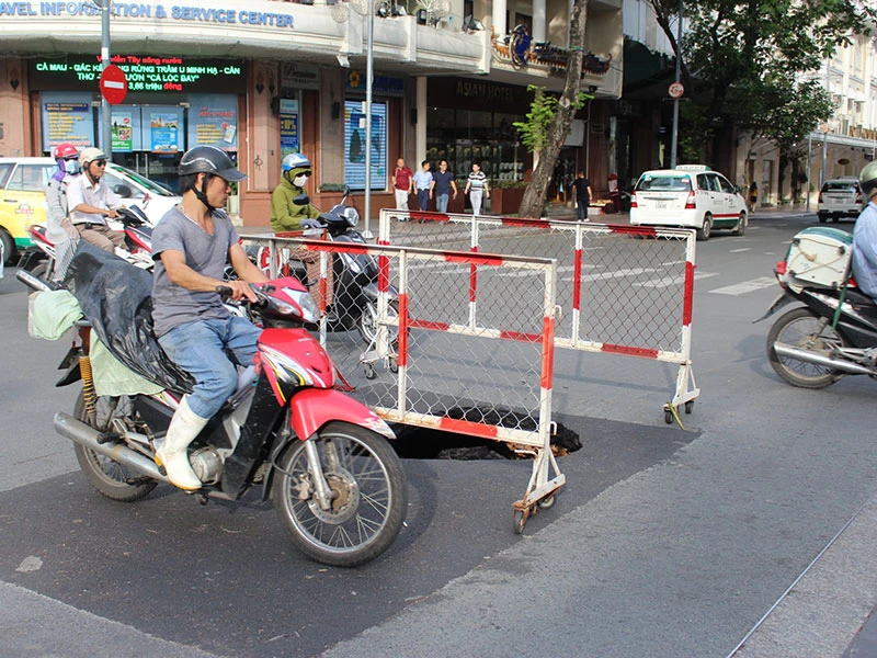 Theo đó chiều 12-6, một số người dân sống trên giao lộ Lê Thánh Tôn- Đồng Khởi và người đi đường cho biết trên đoạn đường này xuất hiện dấu hiệu sụt lún và tạo thành hố sâu.