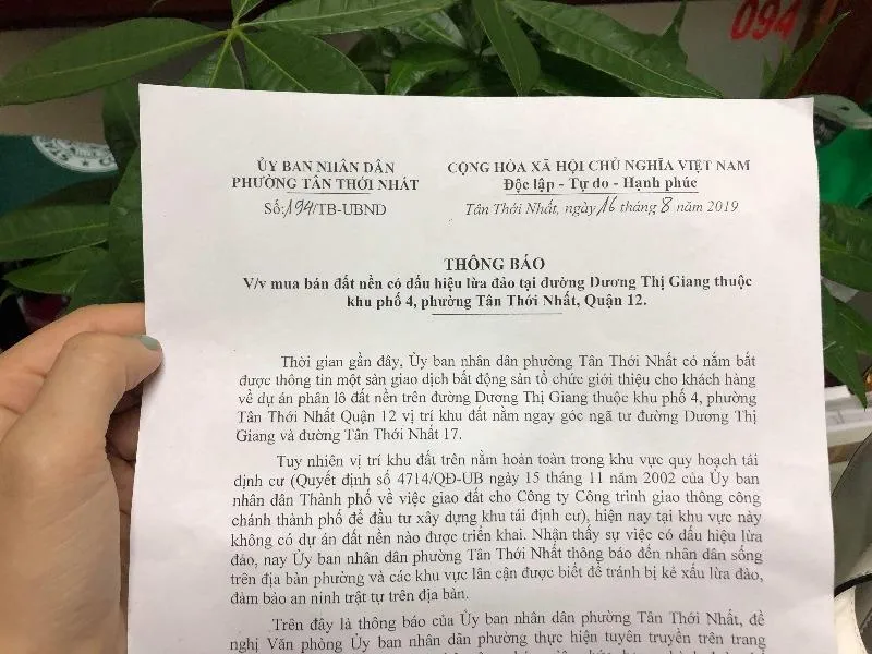 Nhận thấy sự việc có dấu hiệu lừa đảo, UBND phường Tân Thới Nhất ra thông báo đến người dân sống trên địa bàn phường và các khu vực lân cận được biết để tránh kẻ xấu lừa đảo, đảm bảo an ninh trật tự trên địa bàn.