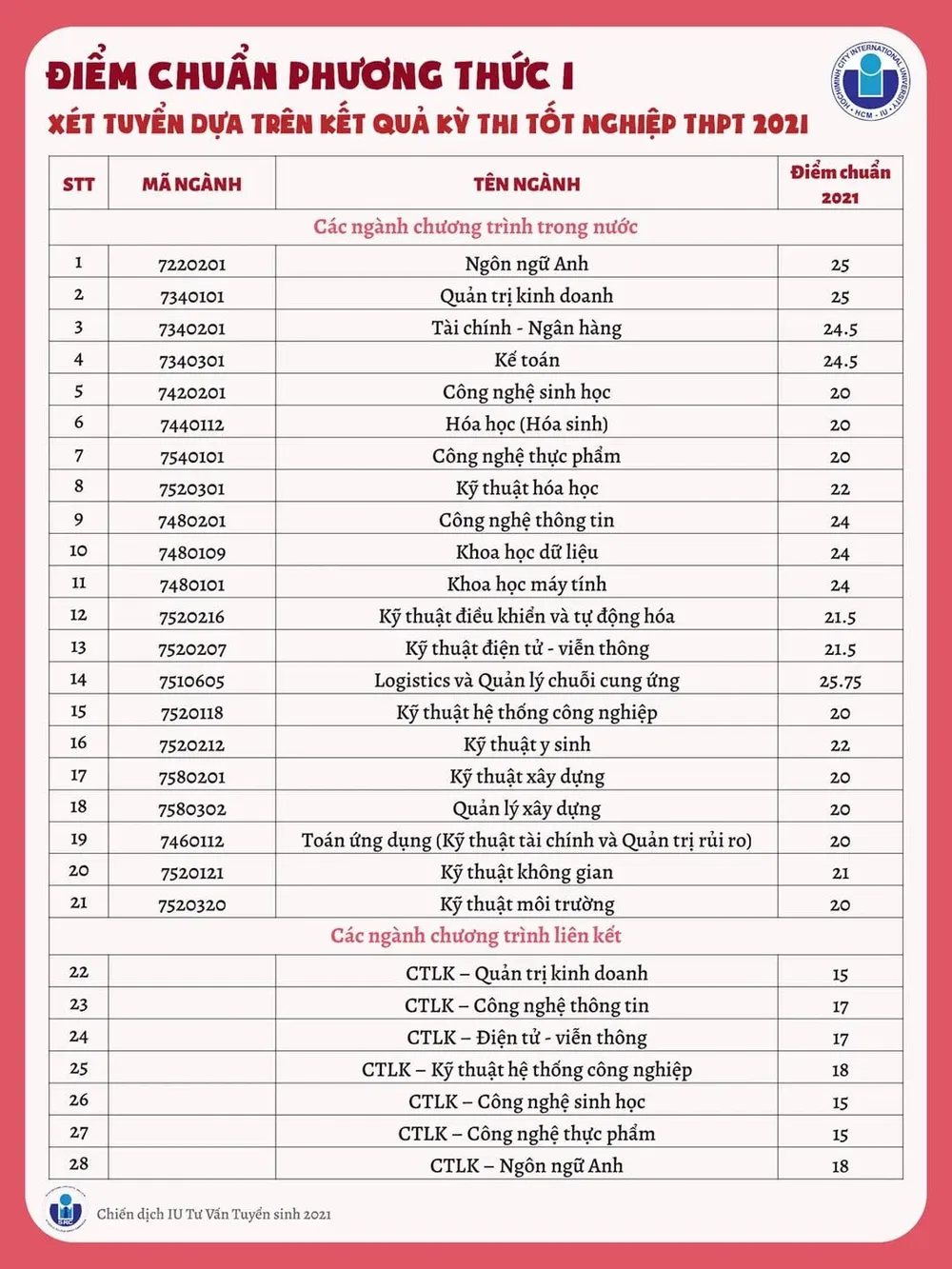 Tại TP.HCM, Trường ĐH Quốc tế (ĐH Quốc gia TP.HCM) cũng có mức điểm chuẩn từ 15 đến 25,75 điểm. Trong đó, cao nhất là ngành Logistics và chuỗi quản lý cung ứng.