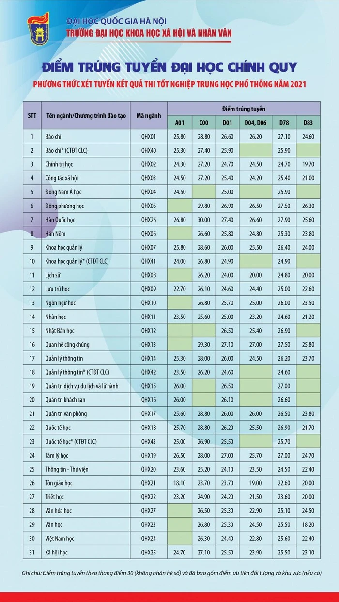Điểm trúng tuyển này theo thang điểm 30 (không nhân hệ số) và đã bao gồm điểm ưu tiên đối tượng, khu vực (nếu có).