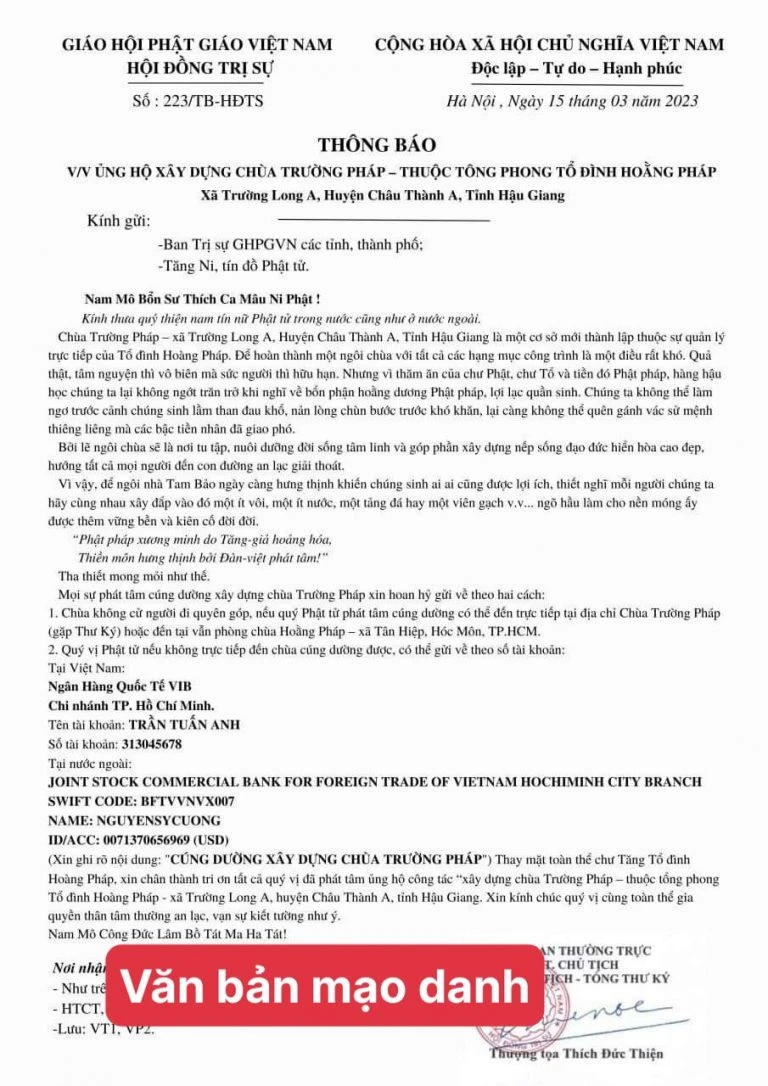 Đáng chú ý, trên mạng xã hội còn xuất hiện văn bản thông báo 223/TB-HĐTS ngày 15-3-2023 kêu gọi ủng hộ, công đức xây dựng chùa Trường Pháp tại xã Tường Long A (huyện Châu Thành, Hậu Giang).