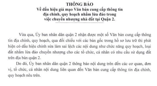 Thông báo của UBND quận 2 về việc xuất hiện văn bản giả mạo cung cấp thông tin địa chính, quy hoạch...