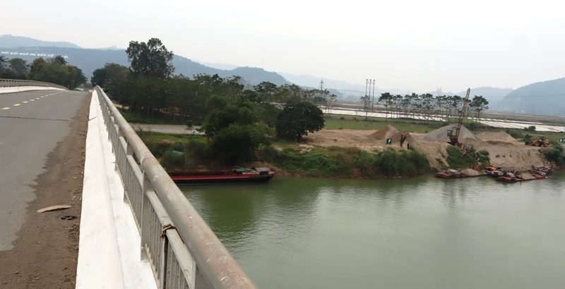 Cầu Nam Đàn bắc qua sông Lam, phía dưới sông có nhiều tàu, thuyền vận chuyển cát, sỏi.