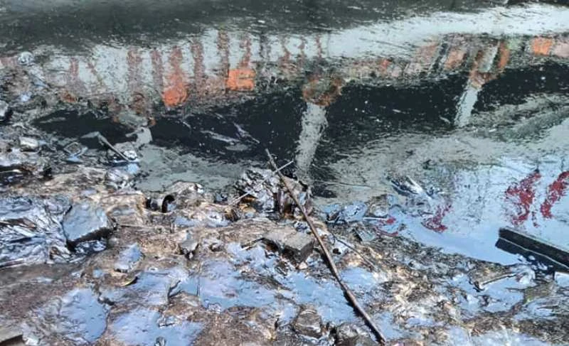 Vết dầu loang màu đen, bốc mùi hôi thối.