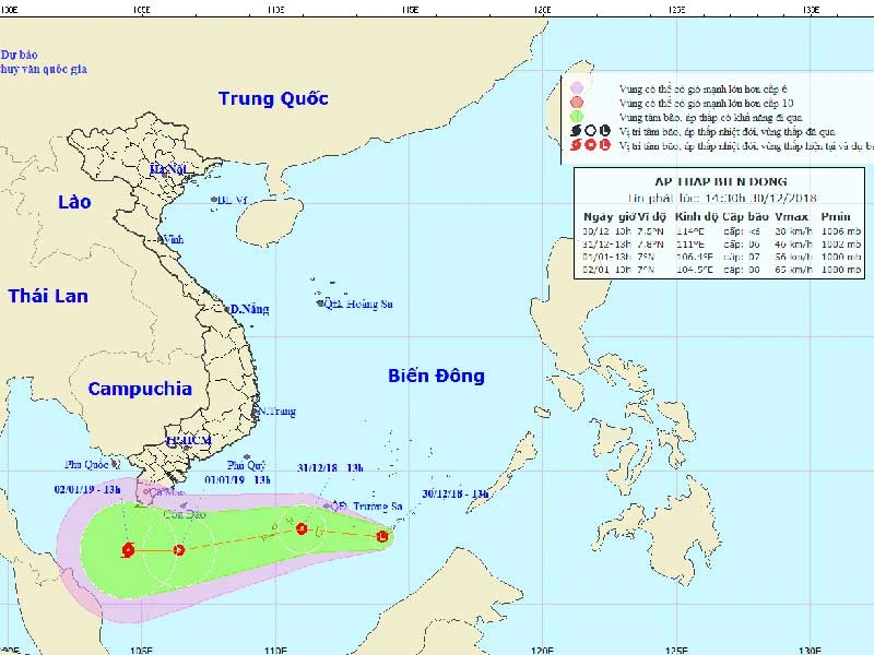 Dự báo trong 24 giờ tới, vùng áp thấp này có khả năng thành áp thấp nhiệt đới. Đến ngày 2-1-2019, vùng áp thấp có khả năng mạnh lên thành bão.
