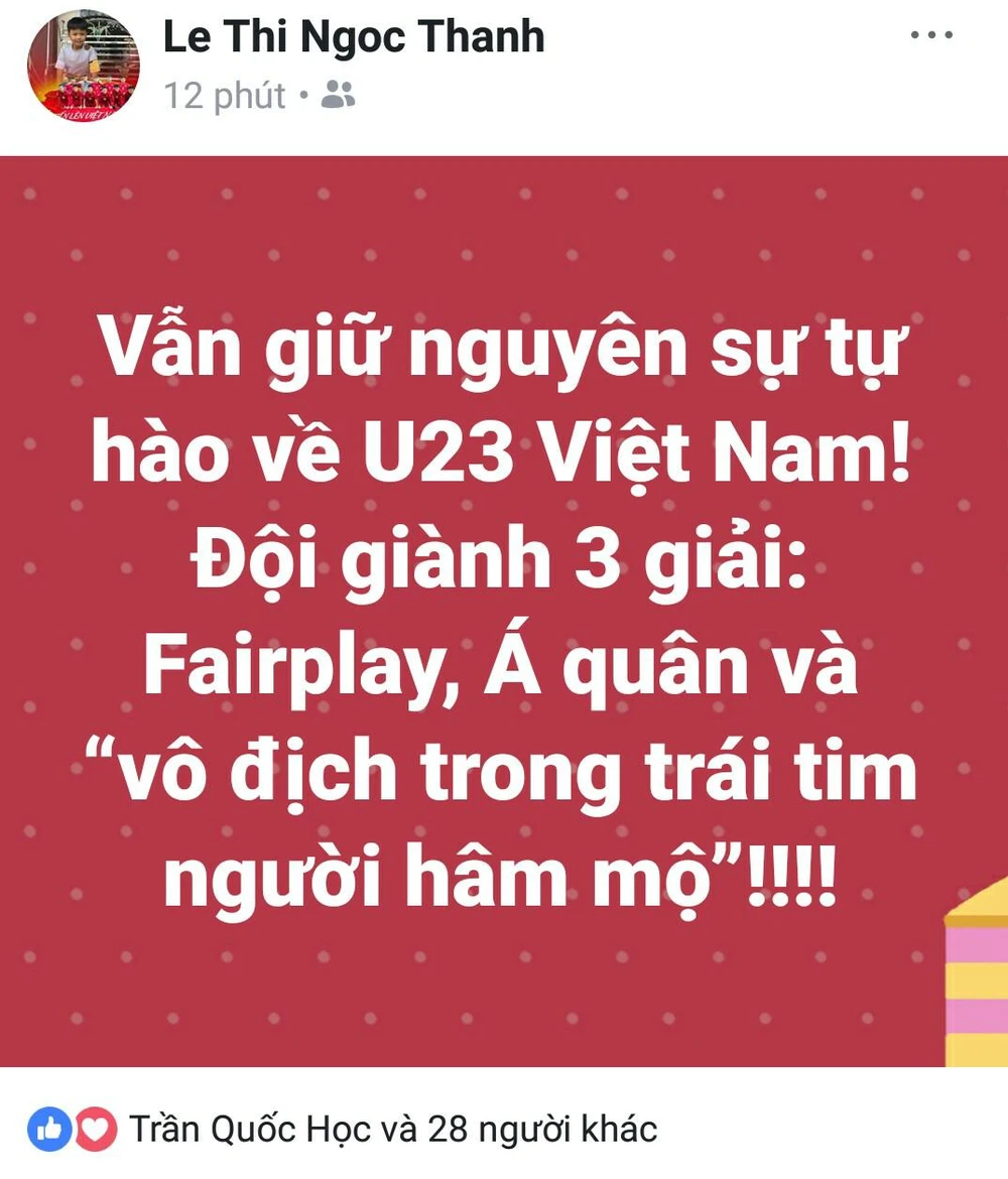“Vẫn giữ nguyên sự tự hào về U-23 Việt Nam! Đội giành 3 giải Fair Play, Á quân và vô địch trong trái tim người hâm mộ” - là chia sẻ của bạn Le Thi Ngoc Thanh. Với các danh hiệu cao quý đó, U-23 đã là một bất ngờ lớn với các đội bạn và là niềm vui sướng vô cùng cho các cổ động viên.