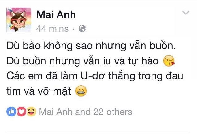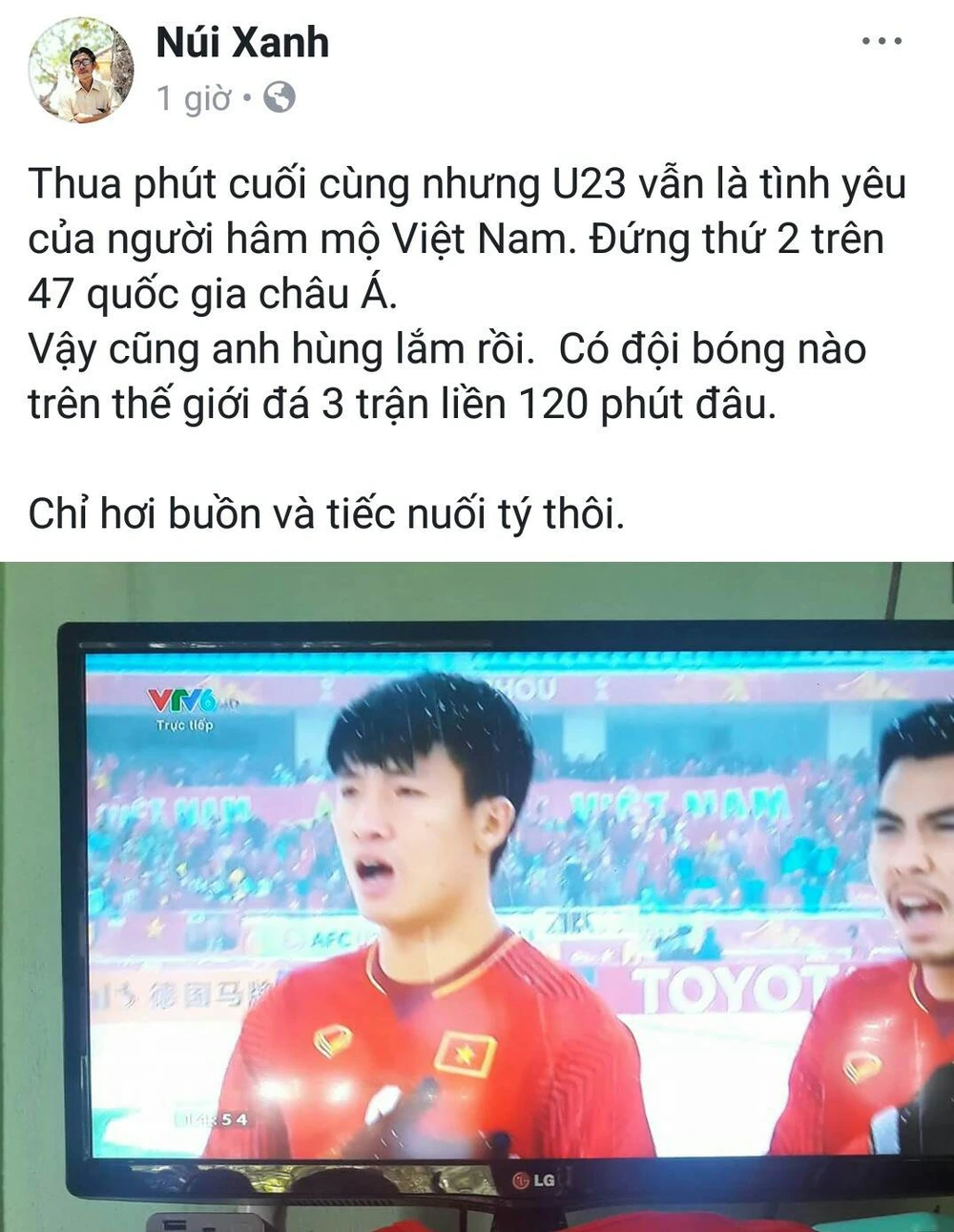 Đồng tình, bạn Hau Nguyen cũng chia sẻ dòng cảm xúc: “Không có kết quả như ý nhưng vẫn còn nguyên lý do để ăn mừng và tự hào. Thật tuyệt các chàng trai U-23 Việt Nam”