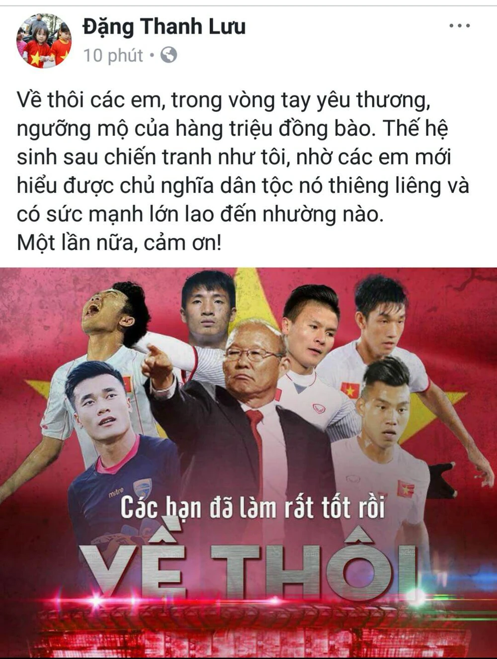 Còn rất nhiều... rất nhiều những cảm xúc tràn dâng dành cho các cầu thủ được cộng đồng mạng chia sẻ trong hôm nay và sẽ còn nhiều ngày sau đó. Cám ơn các anh vì những gì đã đem lại cho bóng đá và người hâm mộ Việt Nam!