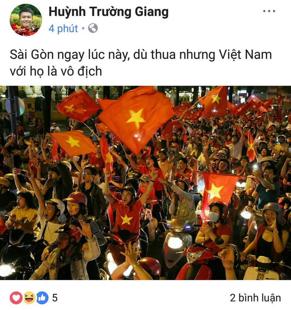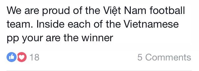 Bạn Ha Truc Pham thay lời muốn nói với toàn thể người dân Việt Nam: “We are proud of the Việt Nam football team. Inside each of the Vietnamese people your are the winner!” (Chúng tôi tự hào về đội bóng Việt Nam, trong mỗi trái tim người Việt Nam các bạn đã là người chiến thắng)
