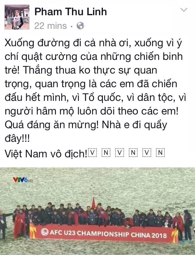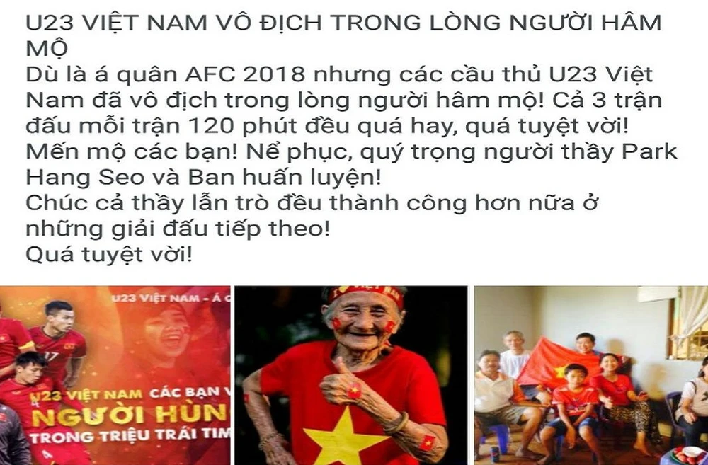 “Dù là á quân AFC 2018 nhưng các cầu thủ U23 Việt Nam đã vô địch trong lòng người hâm mộ! Cả 3 trận đấu mỗi trận 120 phút đều quá hay, quá tuyệt vời! Mến mộ các bạn! Nể phục, quý trọng người thầy Park Hang Seo và Ban huấn luyện. Chúc cả thầy lẫn trò đều thành công hơn nữa ở những giải đấu tiếp theo! Quá tuyệt vời!” là lời kết tuyệt đẹp cho một giải đấu đầy khó khăn và bứt phá của U-23 Việt Nam.