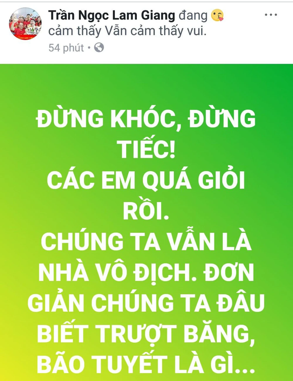 Bạn Kien Cao giữ nguyên sự hài hước khi nói: “Thời tiết sinh anh hùng!”. Bạn Trần Ngọc Lam Giang cũng như hàng triệu người hâm mộ đều hiểu được cái khó của đội tuyển trong trận đấu chiều nay, thời tiết quá khủng khiếp. Bạn chia sẻ một cách vui nhộn: “Đừng khóc, đừng tiếc, các em quá giỏi rồi. Chúng ta vẫn là nhà vô địch. Đơn giản chúng ta đâu biết trượt băng, bão tuyết là gì!”.