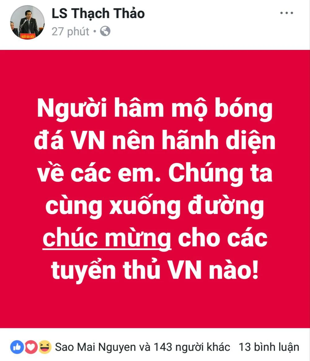 Chia sẻ trên Facebook của mình, luật sư Thạch Thảo nói: “Người hâm mộ bóng đá Việt Nam nên hãnh diện về các em. Chúng ta cùng xuống đường chúc mừng cho các tuyển thủ Việt Nam nào!”. “Xuất sắc đến giây phút cuối cùng. CẢM ƠN CÁC EM” là chia sẻ từ tận trái tim của bạn Nghia Nhan.