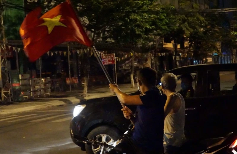 Một người dân vẫy cờ đỏ sao vàng trong thời khắc dỡ phong tỏa. Ảnh: BÙI TOÀN