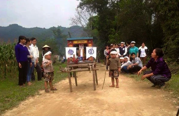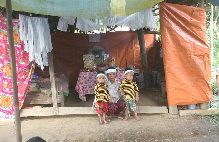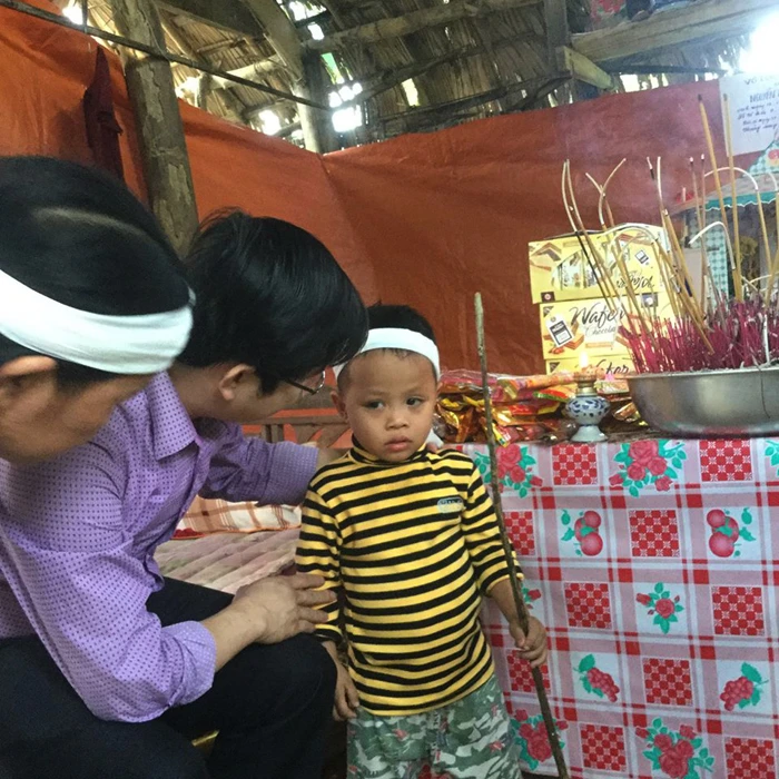 Hai anh em sinh đôi Tuấn và Đức mang khăn tang chống gậy tiễn người mẹ trẻ ra nghĩa trang.