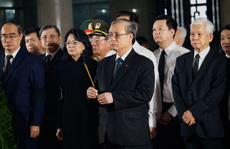 Đến viếng, thắp nhang cho ông Mười Hương, đoàn đại biểu Ban chấp hành Trung ương Đảng do ông Trần Quốc Vượng, Ủy viên Bộ Chính trị, Thường trực Ban bí thư, dẫn đầu.
