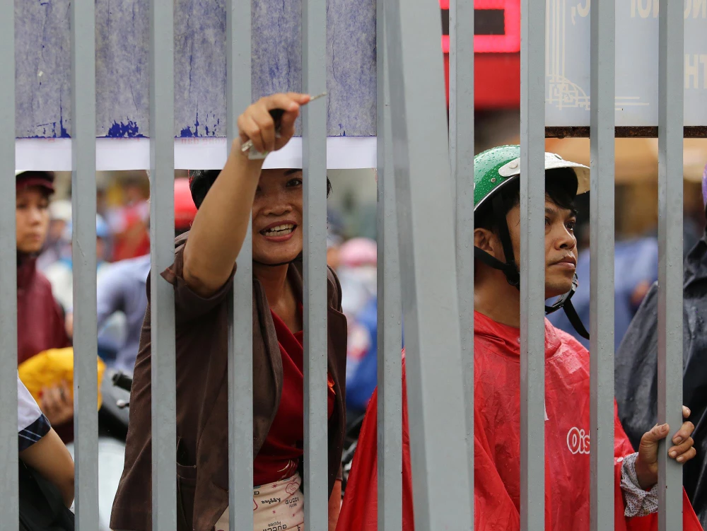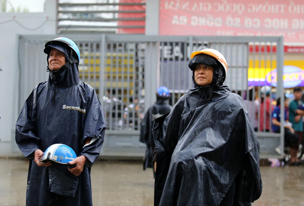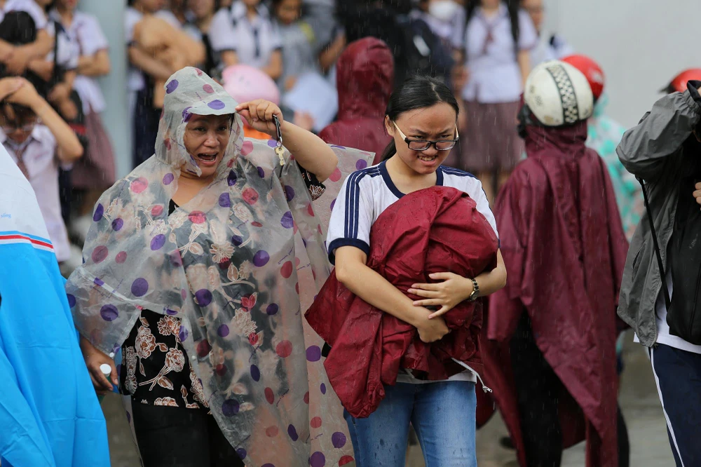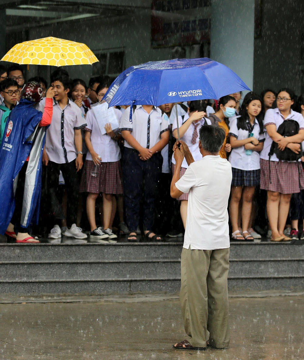 Dù trời mưa lớn, bố mẹ vẫn bám trụ bên ngoài trường tay vẫy gọi con mình vừa ra khỏi phòng thi.